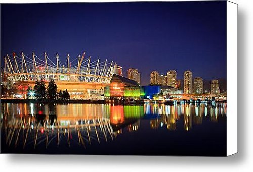 This is a beautiful stretched-canvas print wrapped on 1.5" thick stretcher bars. The print is professionally printed, assembled, and shipped within 2 - 3 business days from our production facility in North Carolina and arrives ready-to-hang on your wall. Fine Art America is home to more than 75,000 artists from all over the world who entrust us to fulfill their print orders online. We offer a 30-day money-back guarantee on every print that we sell and look forward to helping you select your next piece. Keywords: Bc Place Stadium Canvas Print, Vancouver Canvas Print, Long Exposure Canvas Print, Night Time Canvas Print, Lights Canvas Print