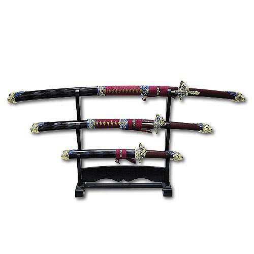 This gorgeous 3 piece Japanese sword set is a superb offering for the serious collector or samurai enthusiast. Each piece is equipped with a stainless steel blade. The nylon cord wrapped handles are accented with zinc aluminum tsuba and pommel, and the wood sheaths are adorned with coordinating cord wrapping and furnishings. The measurements for each item in the set are: Katana: 40 1/2" overall, 26" blade; Wakizashi: 31 1/2" overall, 21 1/2" blade; Tanto: 21 1/2" overall, 11 1/2" blade.